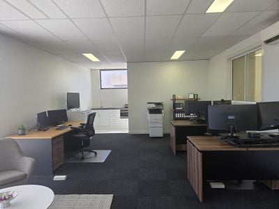 The premises includes a quality first floor office area with kitchenette, amenities, roller shutter door, warehouse with good height and on-site parking.